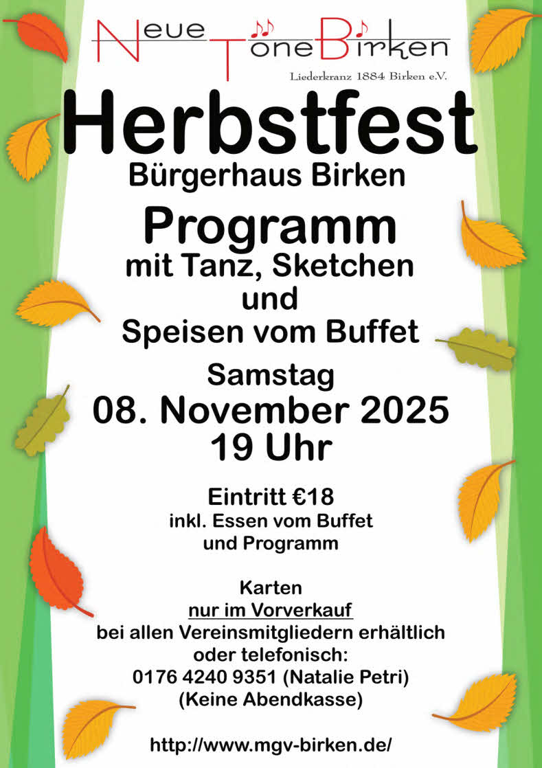 Willkommen bei den „Neue Töne Birken“im „MGV Liederkranz 1884 Birken“Wir, das sind die "New Voices" eine Chorgemeinschaft aus zwei Chören (Happy Voices Mudersbach und Neue Töne Birken) mit 32 Sängerinnen und Sängern. Gesungen wird immer am Donnerstagabend von 19:30- 20:45 Uhr. Dieses Jahr noch komplett im Vereinsheim der Happy Voices in Mudersbach und in 2026 von Januar bis April im Bürgerhaus Birken. Wir singen moderne Lieder in deutscher und englischer Sprache. Interesse geweckt?Die Ansprechpartner sind: Andreas Petri (1. Vorsitzender MGV Birken - Neue Töne Birken)Tel.: 0271 - 3824390 Email: andreas.petri @ mgv-birken.deKarin Preußer-Pfeiffer (1. Vorsitzende Happy Voices Mudersbach)Tel.: 02745 - 1691 Email: kontakt @ liedertafel-mudersbach.deBis hoffentlich bald, es grüßt euch ganz herzlich der Vorstand von Neue Töne Birken. |